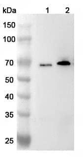 Western blot analysis was performed using anti-FUS polyclonal antibody at 1ug/mL on various samples.Lane 1:N2A cell lysateLane 2:HepG2 cell lysate