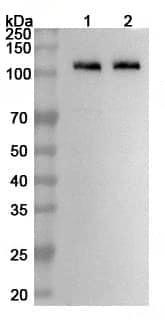 Western blot analysis was performed using anti-DPP6 polyclonal antibody at 1ug/mL on various samples.Lane 1:Rat brain lysateLane 2:Rat cerebellum lysate