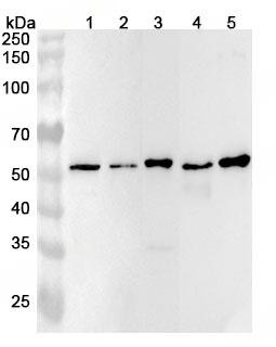 Western blot analysis was performed using anti-ANXA11 polyclonal antibody at 1ug/mL on recombinant ANXA11 (Catalog No.:TD-HW784012).,Western blot analysis was performed using anti-ANXA11 polyclonal antibody at 1ug/mL on various samples.Lane 1:Hela cell lysateLane 2:A431 cell lysateLane 3:Mouse lung lysateLane 4:Rat liver lysateLane 5:Rat heart lysate