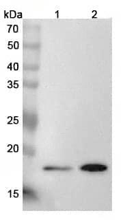Western blot analysis was performed using anti-ARL3 polyclonal antibody at 1μg/ml on various samples.Lane 1:Mouse heart lysateLane 2:Rat heart lysate