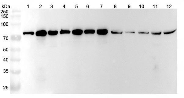 Western blot analysis was performed using anti-GARS1 polyclonal antibody at 1ug/mL on recombinant GARS1 (Catalog No.:TD-HW710012).,Western blot analysis was performed using anti-GARS1 polyclonal antibody at 1ug/mL on various samples.Lane 1:Hela cell lysateLane 2:HepG2 cell lysateLane 3:Jurkat cell lysateLane 4:SH-SY5Y cell lysateLane 5:K562 cell lysateLane 6:293T cell lysateLane 7:NIH3T3 cell lysateLane 8:Mouse brain lysateLane 9:Mouse lung lysateLane 10:Rat brain lysateLane11:Rat liver lysateLane12:Rat lung lysate