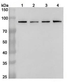 Western blot analysis was performed using anti-STAT3 polyclonal antibody at 1ug/mL on various samples.Lane 1:Hela cell lysateLane 2:A549 cell lysateLane 3:A431 cell lysateLane 4:293T cell lysate