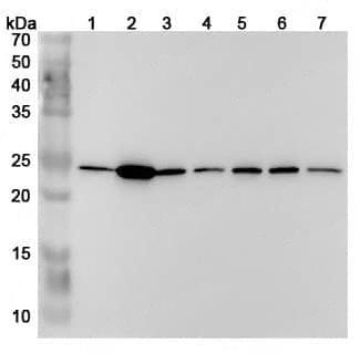 Western blot analysis was performed using anti-PSMB2 polyclonal antibody at 1μg/ml on various samples.Lane 1:Hela cell lysateLane 2:Jurkat cell lysateLane 3:293T cell lysateLane 4:MCF-7 cell lysateLane 5:K562 cell lysateLane 6:HepG2 cell lysateLane 7:U937 cell lysate
