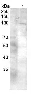 Western blot analysis was performed using anti-GRIA2 polyclonal antibody at 1μg/ml on various samples.Lane 1:SKOV3 cell lysate