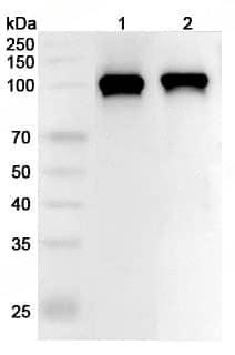 Western blot analysis was performed using anti-DNM2 polyclonal antibody at 1µg/ml on various samples.Lane 1:Mouse brain lysateLane 2:Rat brain lysate
