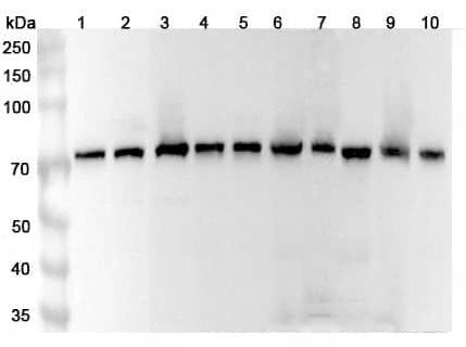 Western blot analysis was performed using anti-Mortalin polyclonal antibody at 1μg/ml on various samples.Lane 1:Hela cell lysateLane 2:K562 cell lysateLane 3:A549 cell lysateLane 4:MCF-7 cell lysateLane 5:HepG2 cell lysateLane 6:Mouse liver lysateLane 7:Mouse brain lysateLane 8:Mouse kidney lysateLane 9:Rat liver lysateLane 10:Rat brain lysate