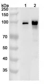 Western blot analysis was performed using anti-CTNNB1 polyclonal antibody at 1ug/mL on various samples.Lane 1:A431 cell lysateLane 2:Lncap cell lysate