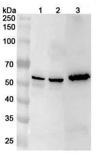Western blot analysis was performed using anti-CHKA polyclonal antibody at 1ug/mL on various samples.Lane 1:HepG2 cell lysateLane 2:Raji cell lysateLane 3:Mouse testis lysate