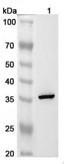 Western blot analysis was performed using anti-GNPDA1 polyclonal antibody at 1ug/mL on various samples.Lane 1:U87 cell lysate