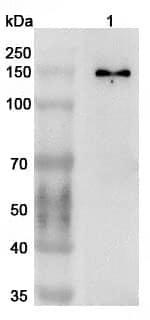 Western blot analysis was performed using anti-ATAD2 polyclonal antibody at 1ug/mL on various samples.Lane 1:K562 cell lysate