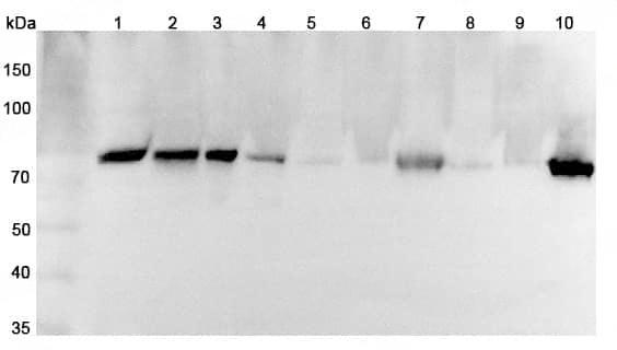 Western blot analysis was performed using anti-SEMA3C polyclonal antibody at 1μg/ml on various samples.Lane 1:Raw264.7 cell lysateLane 2:MCF7 cell lysateLane 3:PC12 cell lysateLane 4:Jurkat cell lysateLane 5:Mouse lung lysateLane 6:Mouse small intestine lysateLane 7:Mouse heart lysateLane 8:Rat lung lysateLane 9:Rat small intestine lysateLane 10:Rat heart lysate