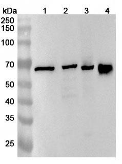 Western blot analysis was performed using anti-SLC40A1 polyclonal antibody at 1ug/mL on recombinant SLC40A1 (Catalog No.:TD-HV370012).,Western blot analysis was performed using anti-SLC40A1 polyclonal antibody at 1ug/mL on various samples.Lane 1:Hela cell lysateLane 2:293T cell lysateLane 3:Caco2 cell lysateLane 4:Rat liver lysate