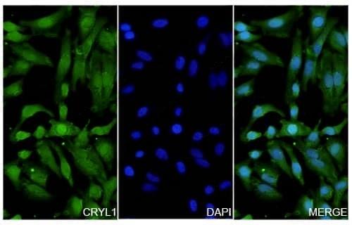 Hela cells were fixed with 4% paraformaldehyde for 20 minutes, followed by blocking with 5% goat serum for 1 hour. The cells were then incubated with a primary antibody targeting CRYL1 (TD-HV315014) at a concentration of 23.75 ug/ml overnight at 4°C. Afterward, the cells were incubated with a secondary antibody, Goat Anti-Rabbit IgG (Alexa Fluor-488) for 50 minutes at room temperature. The localization of CRYL1 was visualized (shown in green), and nuclear DNA was stained with DAPI (shown in blue). | Western blot analysis was performed using anti-CRYL1 polyclonal antibody at 1μg/ml on various samples.Lane 1:MOuse liver lysate