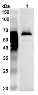 Western blot analysis was performed using anti-LYVE1 polyclonal antibody at 1ug/mL on various samples.Lane 1:Rat brain lysate