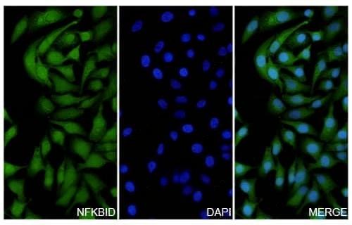 Hela cells were fixed with 4% paraformaldehyde for 20 minutes, followed by blocking with 5% goat serum for 1 hour. The cells were then incubated with a primary antibody targeting NFKBID (TD-HV187014) at a concentration of 12.6 ug/ml overnight at 4°C. Afterward, the cells were incubated with a secondary antibody, Goat Anti-Rabbit IgG (Alexa Fluor-488) for 50 minutes at room temperature. The localization of NFKBID was visualized (shown in green), and nuclear DNA was stained with DAPI (shown in blue).