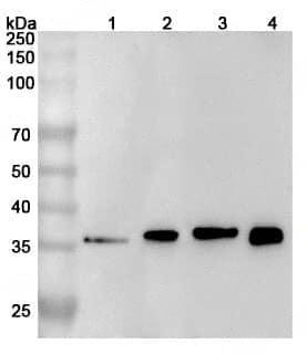 Western blot analysis was performed using anti-TREM2 polyclonal antibody at 1ug/mL on various samples.Lane 1:RAW264.7 cell lysateLane 2:Jurkat cell lysateLane 3:THP-1 cell lysateLane 4:HL-60 cell lysate