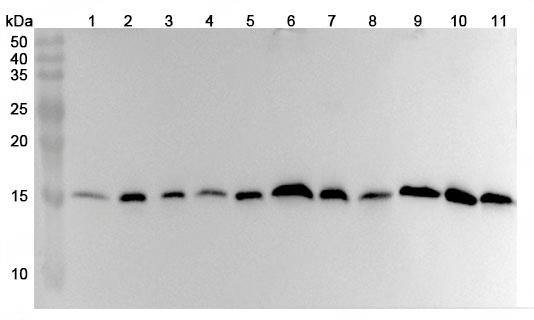 Western blot analysis was performed using anti-FIS1 polyclonal antibody at 1ug/mL on recombinant FIS1 (Catalog No.:TD-HV072012).,Western blot analysis was performed using anti-FIS1 polyclonal antibody at 1ug/mL on various samples.Lane 1:Hela cell lysateLane 2:Jurkat cell lysateLane 3:PC-12 cell lysateLane 4:HepG2 cell lysateLane 5:NIH3T3 cell lysateLane 6:Mouse brain lysateLane 7:Mouse heart lysateLane 8:Mouse spleen lysateLane 9:Rat brain lysateLane 10:Rat heart lysateLane11:Rat spleen lysate