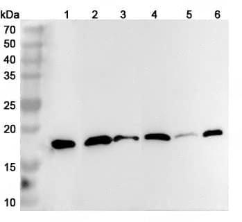 Western blot analysis was performed using anti-CFL2 polyclonal antibody at 1ug/mL on various samples.Lane 1:Raji cell lysateLane 2:Mouse brain lysateLane 3:Mouse lung lysateLane 4:Rat brain lysateLane 5:Rat lung lysateLane 6:Rat skeletal muscle lysate