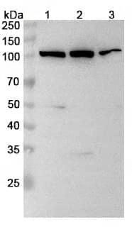 Western blot analysis was performed using anti-ABCB6 polyclonal antibody at 1μg/ml on various samples.Lane 1:Hela cell lysateLane 2:HepG2 cell lysateLane 3:HL60 cell lysate