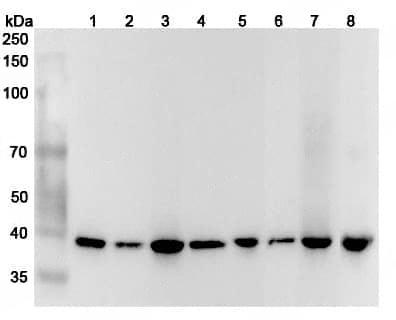 Western blot analysis was performed using anti-GIPC1 polyclonal antibody at 1μg/ml on various samples.Lane 1:HepG2 cell lysateLane 2:Hela cell lysateLane 3:A549 cell lysateLane 4:293T cell lysateLane 5:NIH3T3 cell lysateLane 6:PC-12 cell lysateLane 7:Mouse brain lysateLane 8:Rat brain lysate