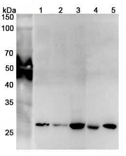 Western blot analysis was performed using anti-PSMA7 polyclonal antibody at 1μg/ml on various samples.Lane 1:HepG2 cell lysateLane 2:Lncap cell lysateLane 3:Jurkat cell lysateLane 4:Mouse liver lysateLane 5:Mouse lung lysate