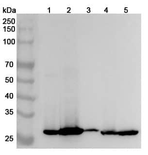 Western blot analysis was performed using anti-PSCA polyclonal antibody at 1ug/mL on various samples.Lane 1:Mouse liver lysateLane 2:Mouse stomach lysateLane 3:Mouse skeletal muscle lysateLane 4:Rat liver lysateLane 5:Rat kidney lysate