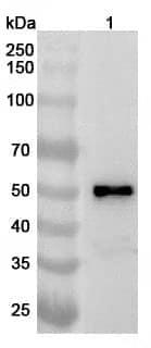 Western blot analysis was performed using anti-DOK2 polyclonal antibody at 1ug/mL on various samples.Lane 1:THP-1 cell lysate