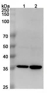 Western blot analysis was performed using anti-MSTN polyclonal antibody at 1µg/ml on various samples.Lane 1:PC-3 cell lysateLane 2:Hela cell lysate