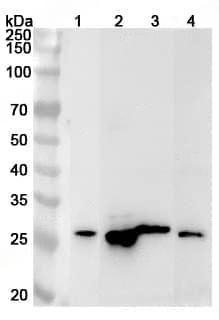 Western blot analysis was performed using anti-DENR polyclonal antibody at 1ug/mL on various samples.Lane 1:NIH3T3 cell lysateLane 2:293T cell lysateLane 3:Mouse brain lysateLane 4:Rat brain lysate