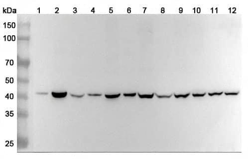 Western blot analysis was performed using anti-SIRPB1 polyclonal antibody at 1ug/mL on various samples.Lane 1:U937 cell lysateLane 2:PC-3 cell lysateLane 3:A549 cell lysateLane 4:HUVEC cell lysateLane 5:Hela cell lysateLane 6:Jurkat cell lysateLane 7:Mouse brain lysateLane 8:Mouse heart lysateLane 9:Mouse cerebellum lysateLane 10:Rat brain lysateLane11:Rat heart lysateLane12:Rat cerebellum lysate