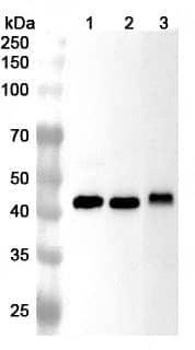 Western blot analysis was performed using anti-CALU polyclonal antibody at 1ug/mL on recombinant CALU (Catalog No.:TD-HT280012).,Western blot analysis was performed using anti-CALU polyclonal antibody at 1ug/mL on various samples.Lane 1:HepG2 cell lysateLane 2:K562 cell lysateLane 3:Hela cell lysate