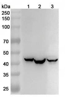 Western blot analysis was performed using anti-IDH3B polyclonal antibody at 1ug/mL on various samples.Lane 1:Mouse brain lysateLane 2:Mouse heart lysateLane 3:Rat heart lysate