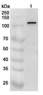 Western blot analysis was performed using anti-MPHOSPH10 polyclonal antibody at 1ug/mL on various samples.Lane 1:Jurkat cell lysate