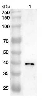 Western blot analysis was performed using anti-BUB3 polyclonal antibody at 1ug/mL on various samples.Lane 1:Jurkat cell lysate