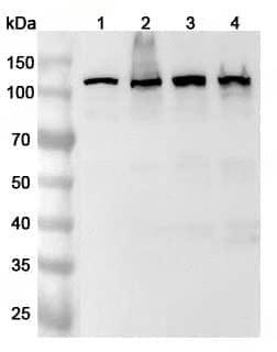 Western blot analysis was performed using anti-SART1 polyclonal antibody at 1ug/mL on various samples.Lane 1:Jurkat cell lysateLane 2:MOLT-4 cell lysateLane 3:Raji cell lysateLane 4:A549 cell lysate