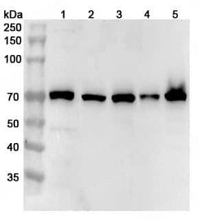 Western blot analysis was performed using anti-RIOK3 polyclonal antibody at 1µg/ml on various samples.Lane 1:NIH3T3 cell lysateLane 2:Jurkat cell lysateLane 3:K562 cell lysateLane 4:Mouse testis lysateLane 5:Rat testis lysate