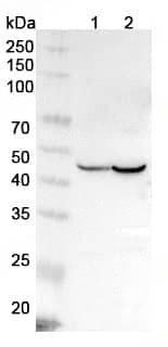 Western blot analysis was performed using anti-ISLR polyclonal antibody at 1μg/ml on various samples.Lane 1:NICH460 cell lysateLane 2:Mouse heart lysate