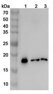 Western blot analysis was performed using anti-MAFK polyclonal antibody at 1ug/mL on various samples.Lane 1:Jurkat cell lysateLane 2:A549 cell lysateLane 3:Mouse lung lysate
