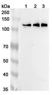 Western blot analysis was performed using anti-KIF5C polyclonal antibody at 1μg/ml on various samples.Lane 1:Mouse brain lysateLane 2:Rat cerebellum lysateLane 3:Rat brain lysate