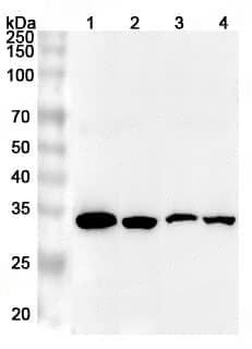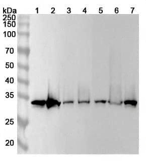 Western blot analysis was performed using anti-ELAVL1 polyclonal antibody at 1ug/mL on various samples.Lane 1:Jurkat cell lysateLane 2:A549 cell lysateLane 3:K562 cell lysateLane 4:H1299 cell lysate,Western blot analysis was performed using anti-ELAVL1 polyclonal antibody at 1ug/mL on various samples.Lane 1:A431 cell lysateLane 2:Jurkat cell lysateLane 3:Hela cell lysateLane 4:A549 cell lysateLane 5:N2A cell lysateLane 6:K562 cell lysateLane 7:H1299 cell lysate