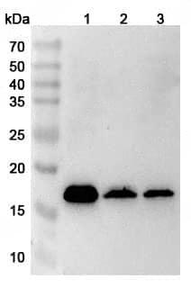 Western blot analysis was performed using anti-MRPL23 polyclonal antibody at 1ug/mL on various samples.Lane 1:A2780 cell lysateLane 2:Hela cell lysateLane 3:MCF-7 cell lysate