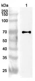 Western blot analysis was performed using anti-CCDC6 polyclonal antibody at 1ug/mL on various samples.Lane 1:K562 cell lysate