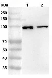 Western blot analysis was performed using anti-VPS16 polyclonal antibody at 1μg/ml on various samples.Lane 1:A549 cell lysateLane 2:MOLT-4 cell lysate