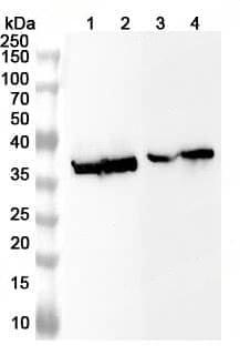 Western blot analysis was performed using anti-P2RX4 polyclonal antibody at 1ug/mL on various samples.Lane 1:Mouse liver lysateLane 2:Mouse kidney lysateLane 3:Rat liver lysateLane 4:Rat kidney lysate