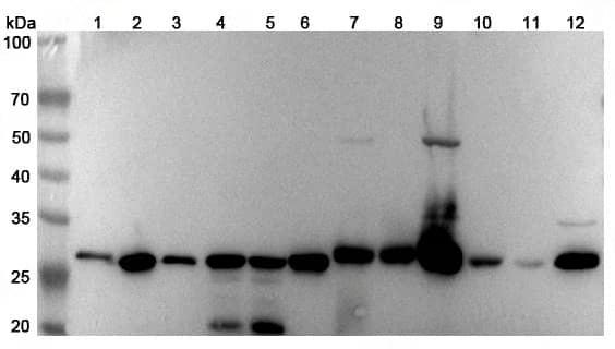 Western blot analysis was performed using anti-CHCHD3 polyclonal antibody at 1μg/ml on various samples.Lane 1:NIH3T3 cell lysateLane 2:Hela cell lysateLane 3:Jurkat cell lysateLane 4:Hepg2 cell lysateLane 5:A549 cell lysateLane 6:293T cell lysateLane 7:Mouse kidney lysateLane 8:Mouse liver lysateLane 9:Mouse heart lysateLane 10:Rat kidney lysateLane11:Rat Liver lysateLane12:Rat heart lysate