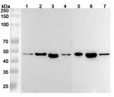 Western blot analysis was performed using anti-RSAD2 polyclonal antibody at 1μg/ml on various samples.Lane 1:HUVEC cell lysateLane 2:Mouse spleen lysateLane 3:Mouse brain lysateLane 4:Mouse lung lysateLane 5:Rat spleen lysateLane 6:Rat brain lysateLane 7:Rat lung lysate
