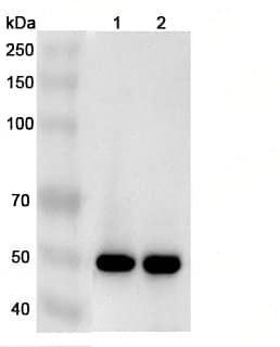 Western blot analysis was performed using anti-EGLN1 polyclonal antibody at 1μg/ml on various samples.Lane 1:293T cell lysateLane 2:HepG2 cell lysate