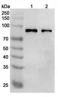 Western blot analysis was performed using anti-TRIM46 polyclonal antibody at 1µg/ml on various samples.Lane 1:Mouse brain lysateLane 2:Rat brain lysate