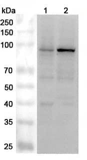 Western blot analysis was performed using anti-DDX21 polyclonal antibody at 1μg/ml on various samples.Lane 1:293T cell lysateLane 2:K562 cell lysate