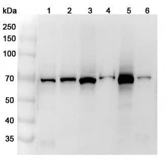 Western blot analysis was performed using anti-DARS2 polyclonal antibody at 1µg/ml on various samples.Lane 1:U937 cell lysateLane 2:K562 cell lysateLane 3:U251 cell lysateLane 4:MCF-7 cell lysateLane 5:HepG2 cell lysateLane 6:HL-60 cell lysate